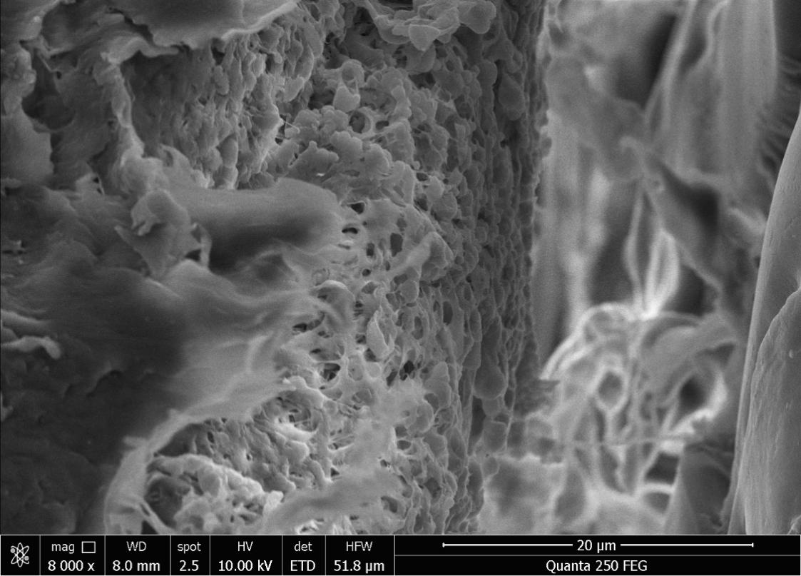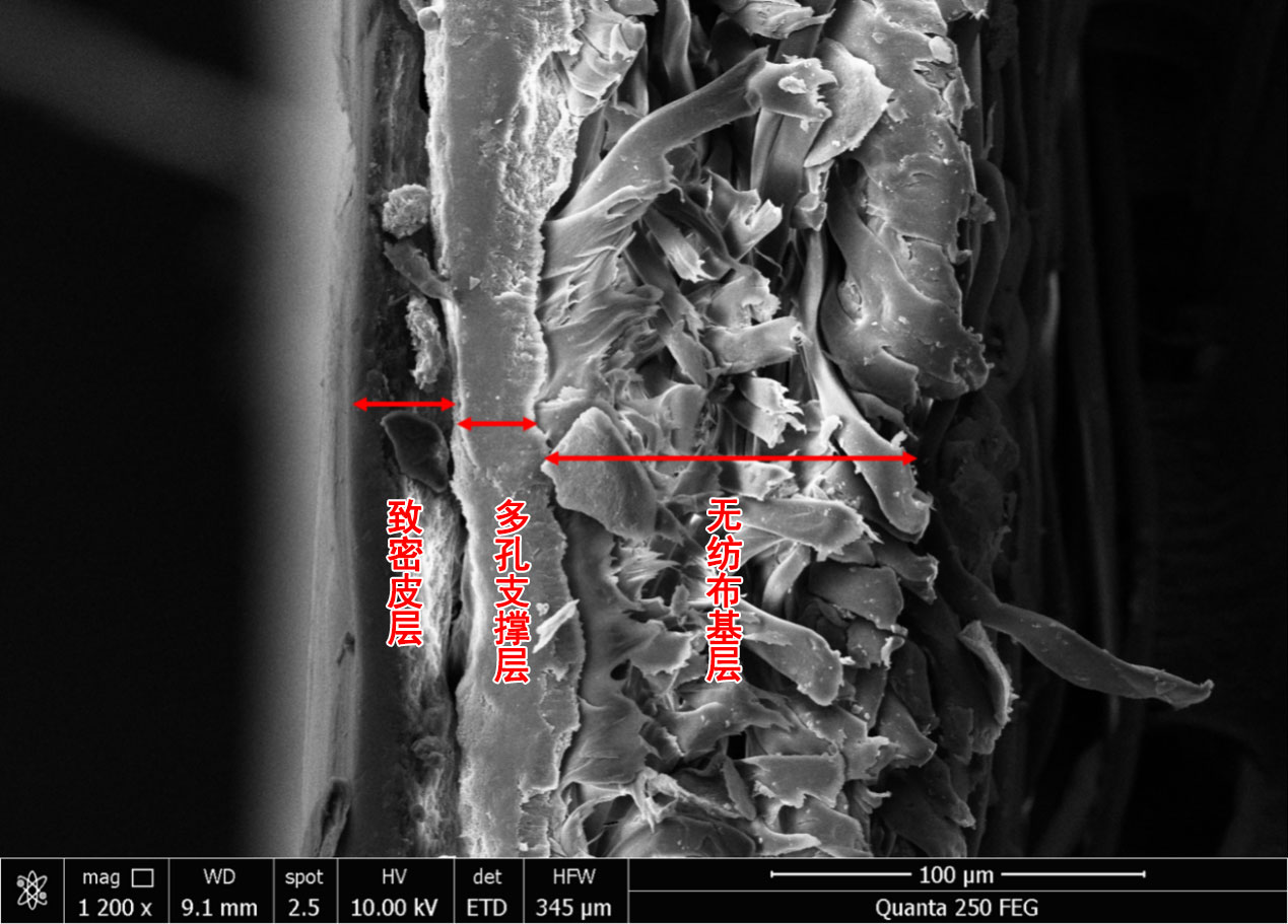 圖三 電鏡下氣體分離膜的三層結構(照片由南京碳環(huán)生物質(zhì)能源有限公司提供)